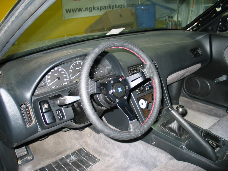 03.)New steering wheel. I've been wanting one for a while. I bought it through weaksauce.org. Collin' hooked me up pretty well. I got a Nardi Deep Corn 330. I'm gald I went with the 330. At first it felt too small but it feels much better than my stock already. Looks like a million bucks plus it has the quick release/lock for the added security. The looks you get walking into a restaurant with a steering wheel in had is priceless. It was also my birthday present to myself. I saved for a little bit.